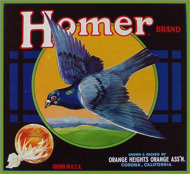 Animal Imagery is a common theme to produce labels, in particular images of birds. Sunkist uses the image of the homing pigeon, a reliable messenger, to promote the "Homer" brand of oranges. The pigeon is rendered in a realistic, painterly style and is framed against a strong geometric design that draws the viewer's attention to the center of the piece.