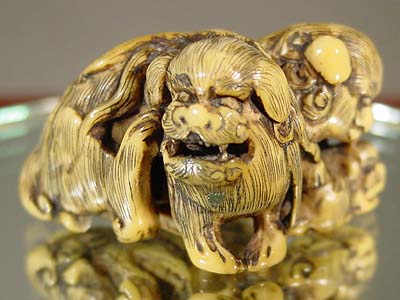 Classic 18th century ivory netsuke depicting a family of three Shishi (Chinese Lions). Male stands guard while scratching at his ear. Female leans lovingly over her cub. Fearsome expressions. Faint traces of green pigment on male. Well carved with nice detail. A symbol of strength and familial loyalty. SOLD |