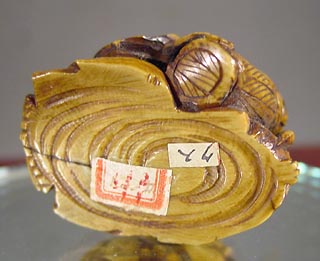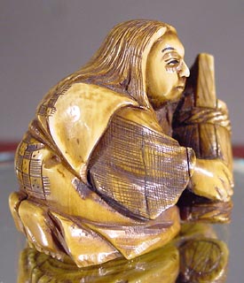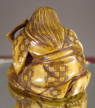 Because there are no ( himotochi ) holes in bottom, this carving may classify as an okimono, miniature Japanese sculpture. However, the channel behind the figures right wrist could serve the same purpose as the himotochi, so the figure can still be classified as netsuke. |