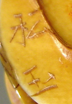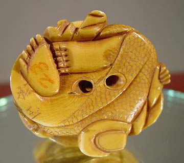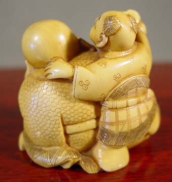 Collected in Japan circa 1935 19th century stained elephant ivory netsuke depicting the god of happiness and good fortune Hotei, with a small child filling his cup. Nicely carved with lovely surface detail on kimonos. SOLD |