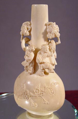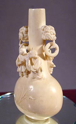 Antique Japanese Ivory Bottle with Ornate Carving Circa 19th century AD collected circa 1930 SOLD Museum quality, stunningly crafted, antique long-neck ivory bottle decorated with lion head handles and four figures. Figures on one side hold a scroll decorated with floral designs. Two dancing figures on opposite side. Lion head handles with separate rings, carved from one piece of elephant ivory. Cherry blossom design carved on one side, another botanical design on the other, probably a lily. Beautiful detail and patina. Full bodied form with extended neck. |