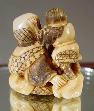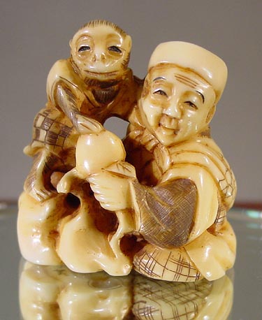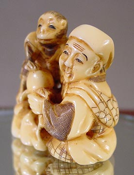 Japanese Antique Ivory Netsuke Man with Monkey ( Sarumawashi ) 19th century AD SOLD dimensions: 1 1/2" high x 1 3/8" wide x 7/8" deep