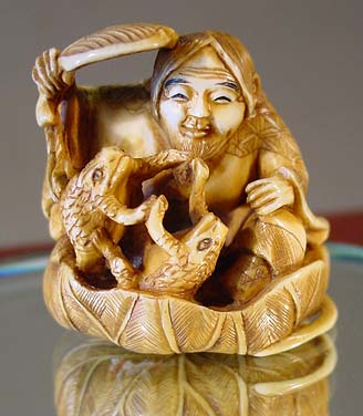 19th century stained ivory netsuke depicting a man (possibly the immortal Gama Sennin) sheltering two wrestling frogs with his fan. The grouping is seated on an intricately detailed Lotus Lilly pad, as though gliding over the water in a small round boat. The scene has a playful mood. The toads remind the viewer of children or playful kittens, and the man looks on with a proud, fatherly expression. Well crafted, humorous carving with nice detail. SOLD |