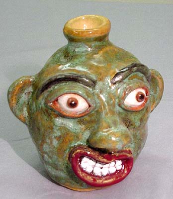 This jug head vessel was created by Elizabeth for her art students as an example of Appalachian style head jugs. The multi-colored glazing is wonderfully done. The white glaze used on the eyes is translucent, giving them an intense life-like quality. The wild expression and simple style of the face are clearly Elizabeth's work. |