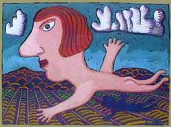"I indulge myself by doing whatever I like in the studio. I carve Styrofoam. I make constructions in cardboard and papier-mâché, and sculptures and forms in clay. I fool around with collage a little, and paint in acrylic and gouache. I see streams of connection in my work; mystery, wonder, the powerful wildness of our natures lurking behind the trees. I create series' of related work as a vision overtakes me: The Mountain Climber Series-Women, strange looking women, on a courageous journey into the mountains. The Horse Series – The wise, sexually powerful horses halted and subdued or doing things un-horselike; potent energy bridled by time constraints, life constraints. The Bears in the Woods – The unseen wild natural forces that dwell within peeking out, hiding, venturing out; and then when no one can see them, they come out and dance and make merry in privacy and nature. Then there are the “Into the Woods” paintings-women, secure and unselfconscious, naked – merging with the wild and natural, as if they are returning to their unfettered origins, melding with nature; relaxing, accepting, appreciating, and feeling whole." |